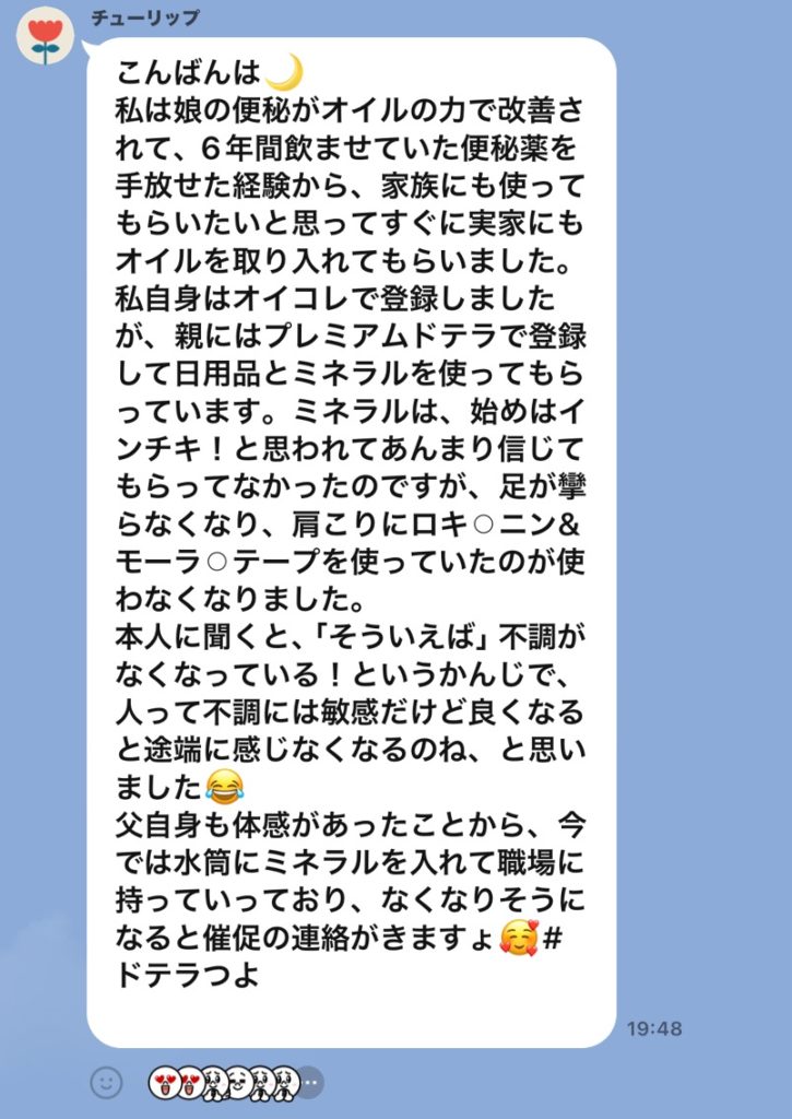 家族のケアだけでなく、ご自身のインナーケアにもドテラを活用され、人生が激変するほどの変化を感じていらっしゃる様子♡